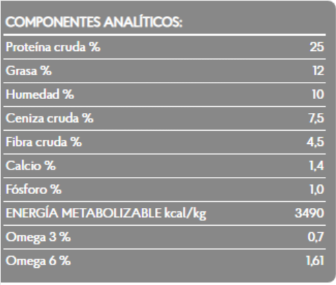 Proteína bruta 25 %, contenido de grasa 12 %, humedad 10 %, ceniza bruta 7,5 %, fibra bruta 4,5 %, calcio 1,4 %, fósforo 1,0 %.