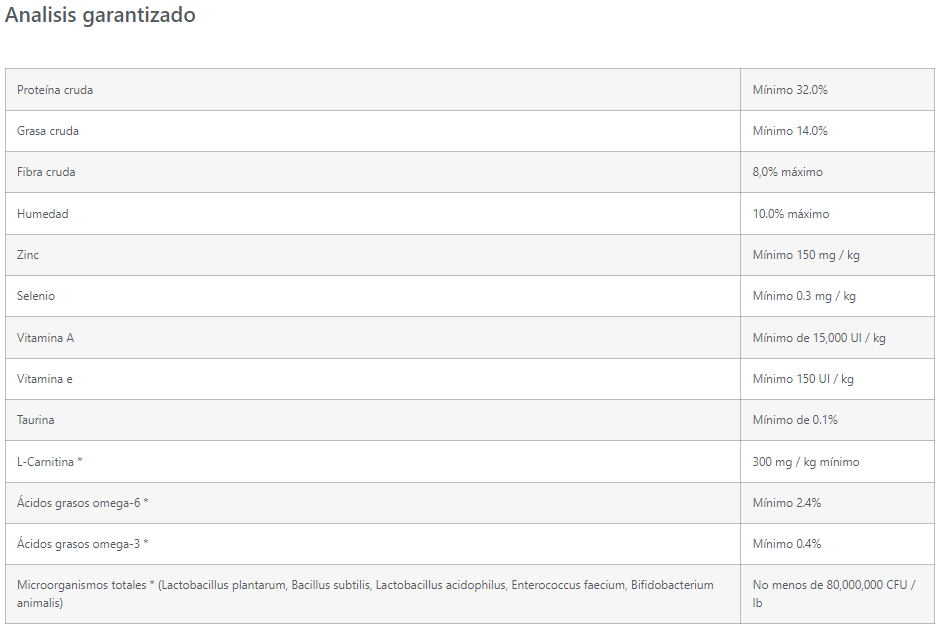 Harina de pollo, pollo, arroz molido, cebada quebrada, celulosa en polvo, grasa de pollo (preservada con mezcla de tocoferoles), saborizante natural, harina de pescado, linaza, bisulfato de sodio, cloruro de colina, DL-metionina, taurina, raíz de achicoria deshidratada, L-Carnitina, chícharos, col rizada, chía, calabaza, arándanos, naranja, quinoa, alga marina, coco, espinacas, zanahorias, papaya, Lactobacillus acidophilus, Bifidobacterium lactis, extracto de yuca schidigera, vitaminas, minerales, minerales quelados, ácido fólico.