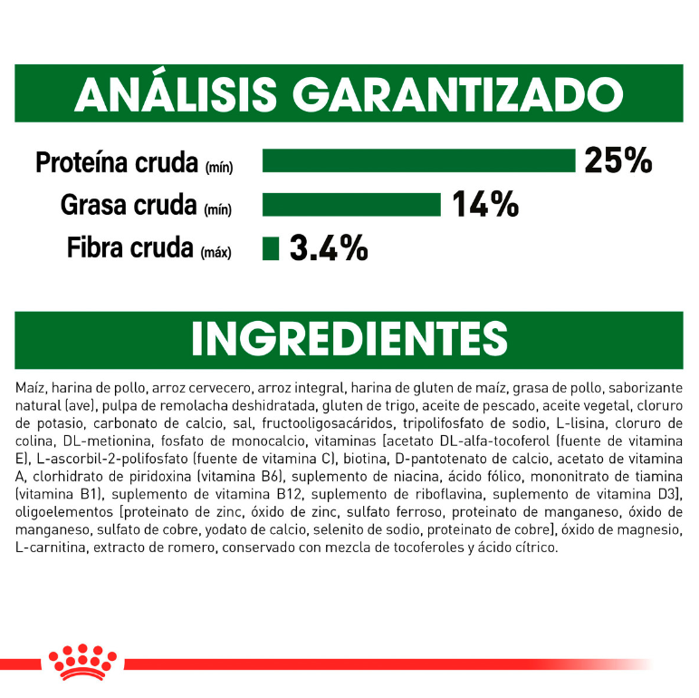 Royal Canin Mini Adult es un alimento para perros adultos de tamaño pequeño (de 1 a 10 Kg) desde los 10 meses hasta los 8 años. La L-Carnitina estimula el metabolismo de las reservas grasas. Satisface las necesidades energéticas gracias al contenido adaptado en calorías (